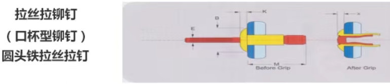 拉丝拉铆钉 (又称口杯铆钉) 是一款结构独特、铆接强度较高的金属链接件,属于新型紧固零件,钢结构抽芯铆钉。拉丝铆钉的钉钉芯被拉进铆体后,在专用铆钉枪枪头一环切(凸出) 枪头作用下,钉芯断钉处会翻边入铆体凹槽内形成“机械外锁”锁紧钉芯。拉丝铆钉具有良好的填充孔性能、气密性好、铆接强度高。适用表面要求较高,铆接强度要求高,对密封性能有较求的铆接领域。广泛应用于轻轨、汽车、船舶、飞机、列车、集装箱、高压机柜、机械钢结构等。材质有不锈钢、铁、铝等材料。具有操作简便、铆合优良、外型美观、单向进行铆接特点。